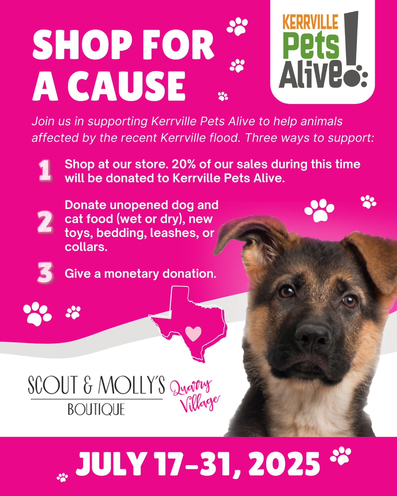 Shop for a Cause TODAY at Scout & Molly’s!  Now through July 31Join us in supporting Kerrville Pets Alive to help animals affected by the recent Kerrville flood.We’re accepting both monetary donations and pet supplies to aid local pets in need.  Also, 20% of all proceeds during this time will be donated to Kerrville Pets Alive.Donation Items […]