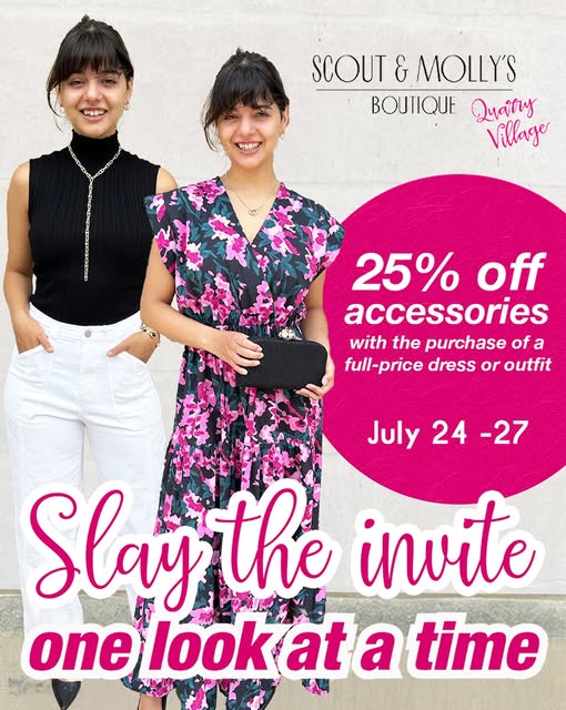 Slay the invite, one look at a time! ✨ Whether you’re headed to brunch, a summer soirée, or just stepping out in style, now’s the perfect moment to elevate your outfit. From July 24–27, enjoy 25% OFF accessories with the purchase of any full-price dress or outfit at Scout & Molly’s Quarry Village! It’s your […]